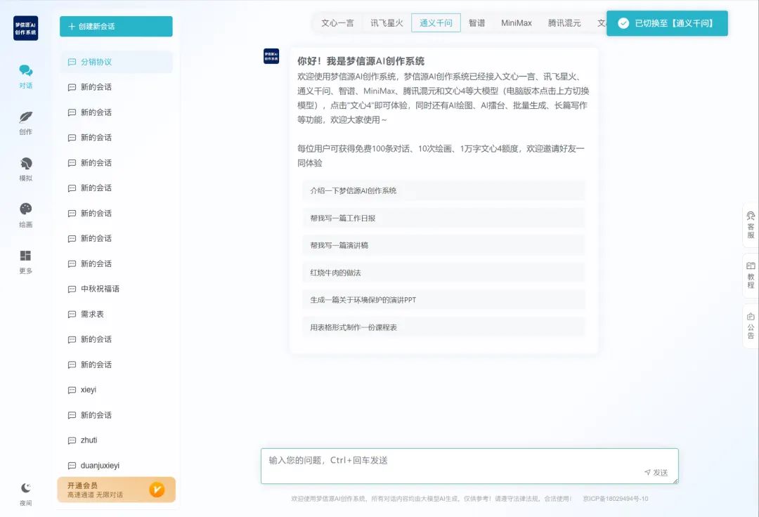 VIP有效期內(nèi)文心一言、訊飛星火、通義千問、智譜、MiniMax、騰訊混元、天工AI、Kimi、百川AI、DeepSeek、商湯日日新和豆包AI等12款國內(nèi)主流AI模型無限制使用(VIP可用功能:對話、創(chuàng)作、模擬和AI擂臺、AI繪圖、AI擂臺、批量生成、長篇寫作、思維導圖和文檔解析)