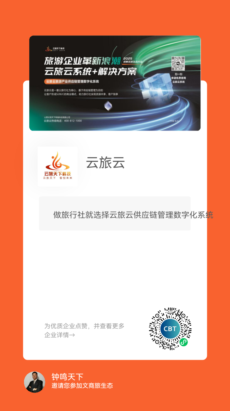 專業(yè)度高,客戶匹配精準!云旅云系統(tǒng)涵蓋了旅行社業(yè)務的全方位需求,云旅云正在引領(lǐng)著旅游行業(yè)邁向一個更加美好的未來。