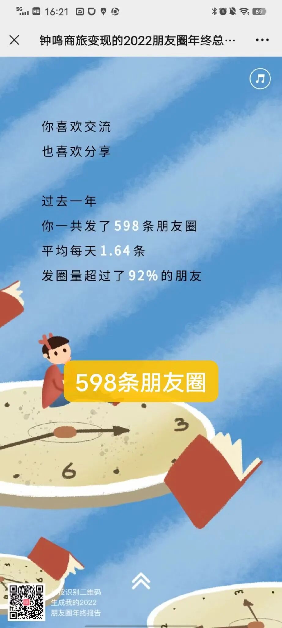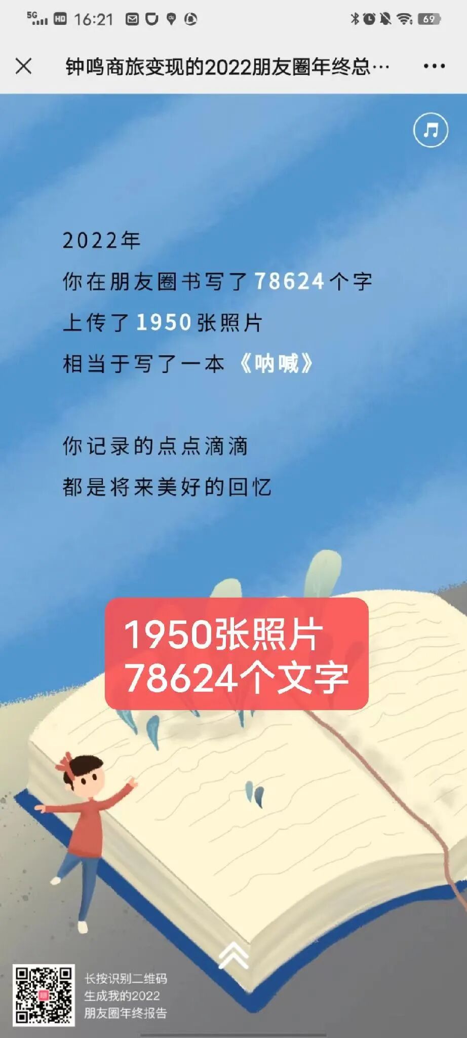 2022年一共發(fā)了598條朋友圈,寫了78624個字,上傳了1950張照片,相當于寫了一本《吶喊》,對!2022年就是我們文商旅從業(yè)者吶喊的一年!